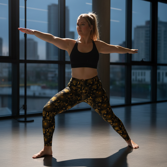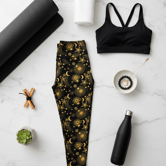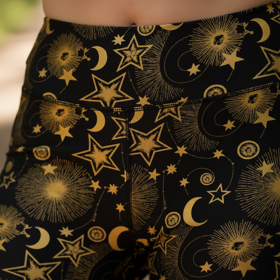 The Midnight Halo Yoga Leggings bring celestial magic to your active wardrobe. Featuring a striking black and gold print of stars, moons, and suns, these premium leggings are designed for those who love to stand out.